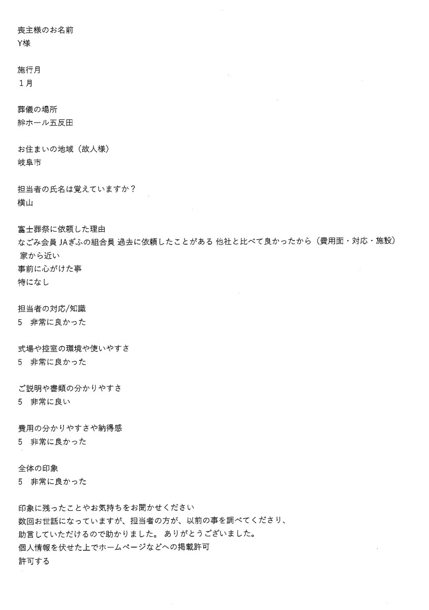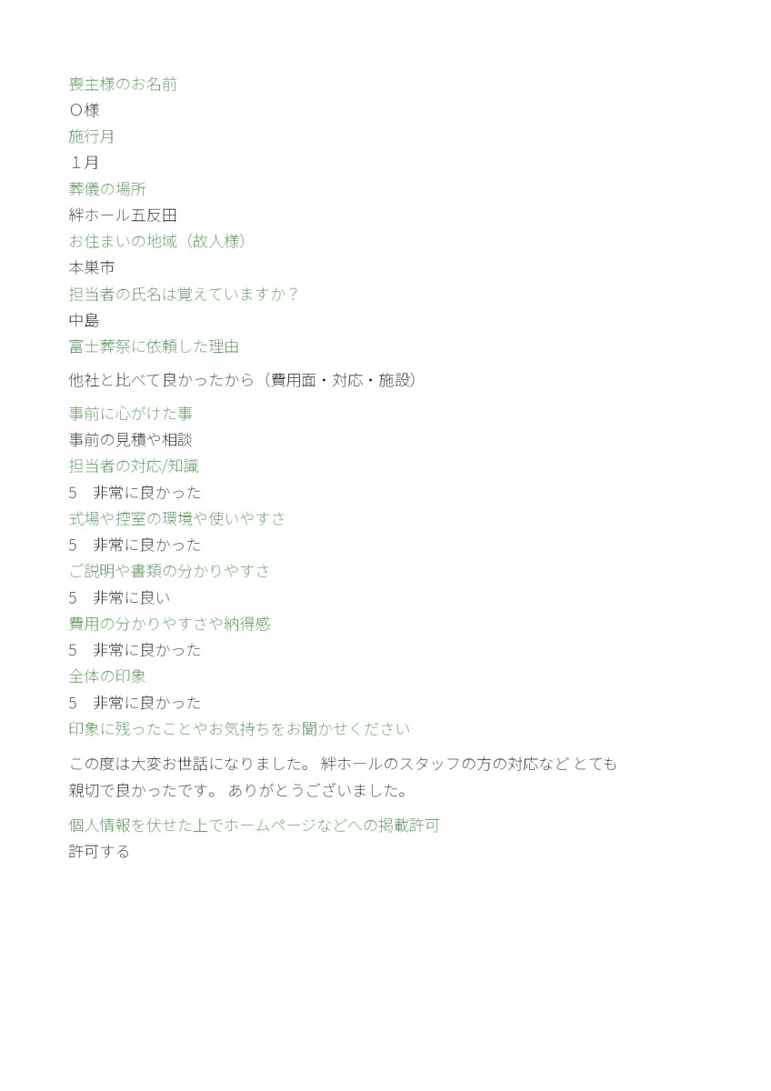 父が他界し、気持ちの余裕がなく、初めてのことばかりで不安も大きいなか、丁寧に優しく、遺族の気持ちに寄り添いながら進めていただけて、とても頼もしかったです。曲の依頼をしたり、ギリギリの数量変更等も快く迅速にご対応くださりとてもありがたかったです。遠藤さんが担当で、本当に良かったです。ありがとうございました。